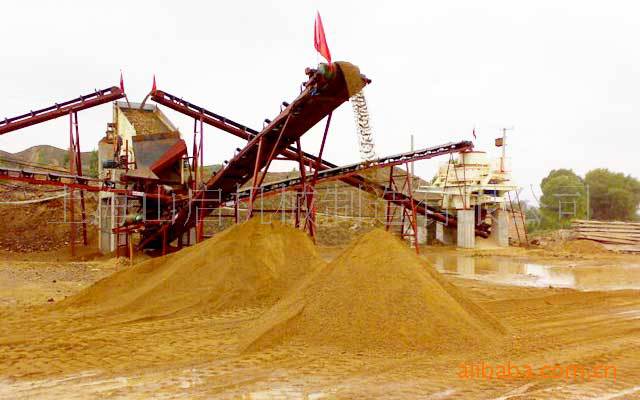 一条完整的制砂生产线由振动给料机,鄂式破碎机,制砂机,振动筛,洗砂机及皮带输送机组成。原材料由振动给料机进到鄂式破碎里进行初碎,然后碎粉过的材料由皮带输送机转移到制砂机里进行中碎.这些破碎后的物料将被传送到振动筛里。尺寸合适的物料会被传送进洗砂机里,清洗完后,干净的物料从排料口排出。其它尺寸不合适的的物料将被重新放入振动筛内,然后重新转移到制砂机中,形成一个封闭和循环的周期。